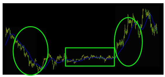 因此我们应该注意:使用移动平均线时一定要在行情有明显波动时,即比较明确的上升及下降趋势时才可以使用,在汇价盘整时使用移动平均线分析走势,失误率很高。