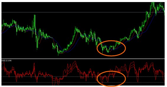 如图所示,在汇价盘整时期,RSI 曲线上接连出现了三个谷底,形成三重底形态,由此判断,汇价将突破上扬。