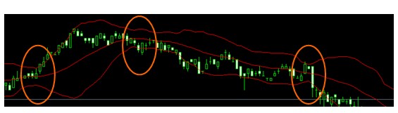 当汇价突破整理格局;开始进行趋势行情时,布林线指标两条界限的距离会扩张。汇价走势若较强劲时,汇价会紧贴着上限或下限,忽而突破,忽而跌破。这种情形下,读者不可以视汇价突破布林线上限而卖出,或视汇价跌破布林线下限而买进。